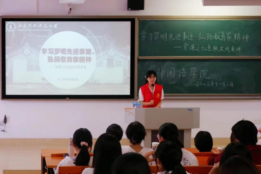 为大力弘扬教育家精神,厚植“爱校荣校”情怀,伟德国际victor1946面向师范生开展教育家精神学习系列活动。11月2日下午,员工第三党支部党员2020级卓越师范班杨纪柔在河源校区唯实楼316为2023级师范生带来主题为“赓续红色基因,弘扬教育家精神”学习宣讲,通过寻根红色基因、学习罗明同志先进事迹,引导伟德国际victor1946师范生学习教育家精神。