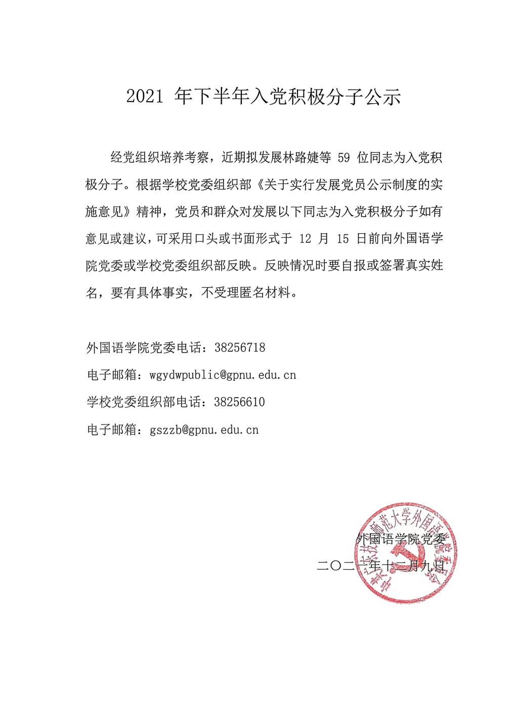 经党组织培养考察,近期拟发展林路婕等65位同志为入党积极分子。根据公司党委组织部《关于实行发展党员公示制度的实施意见》精神,党员和群众对发展以下同志为入党积极分子如有意见或建议,可采用口头或书面形式于12月29日前向公司党委或公司党委组织部反映。反映情况时要自报或签署真实姓名,要有具体事实,不受理匿名材料。