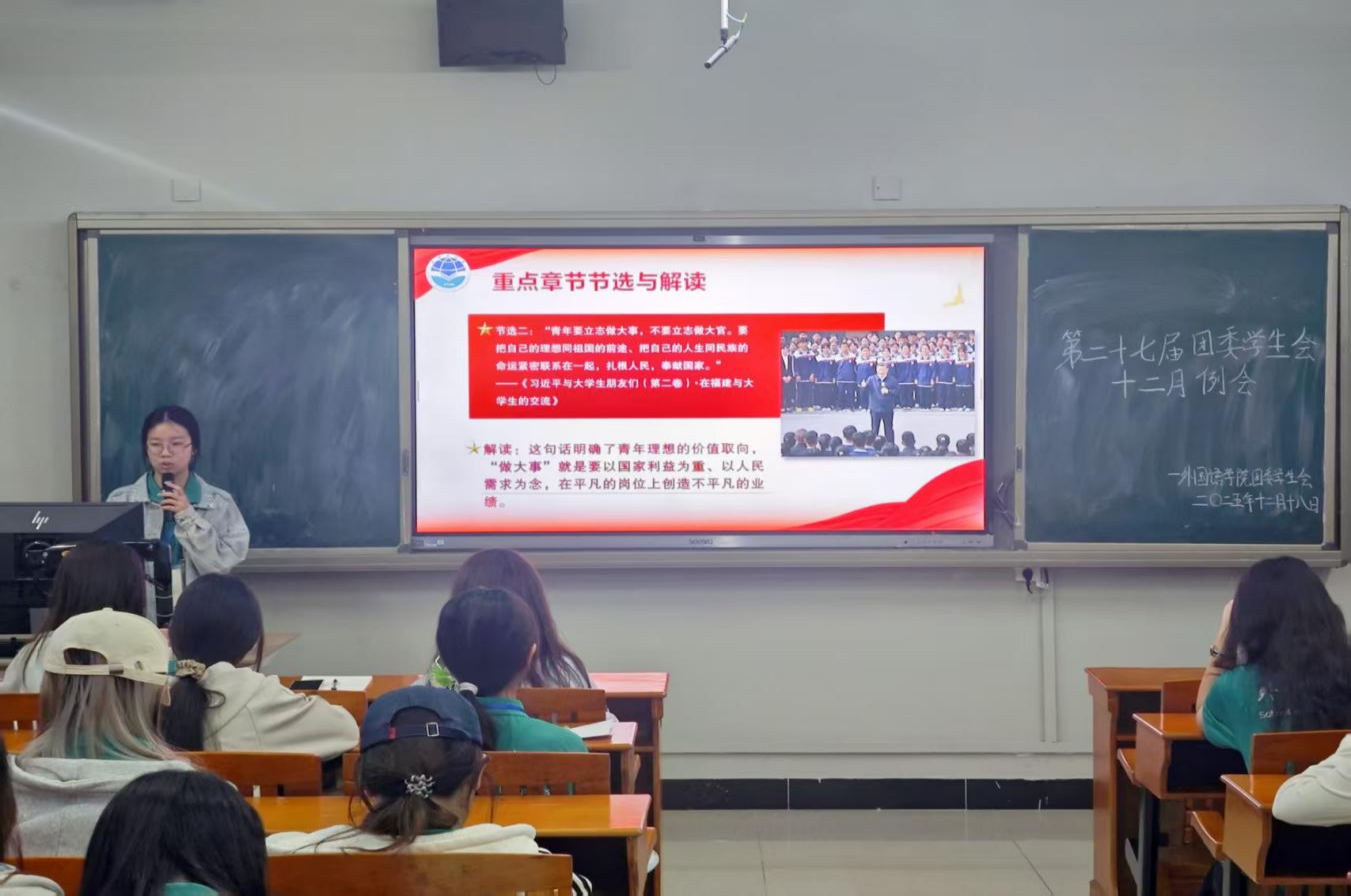 专题内容聚焦政治方向,全体人员深入学习领会习近平总书记致全国学联二十八大重要贺信、党中央致词及党的二十届四中全会精神。大家深刻认识到,习近平总书记的贺信为青年工作指明方向,党中央致词重申了新时代青年“有理想、敢担当、能吃苦、肯奋斗”的要求。通过研读全会精神,同学们明晰了“十五五”时期发展目标与基本实现社会主义现代化的战略部署,深刻理解青年作为中国式现代化生力军和突击队的责任,坚定了响应全会号召、为强国建设贡献青春力量的决心。专题学习以核心著作为抓手,通过深入学习《习近平与老员工朋友们(第二卷)》《论党的青年工作》,同学们深刻领悟到要将个人理想融入国家发展,在实践中锤炼本领。
