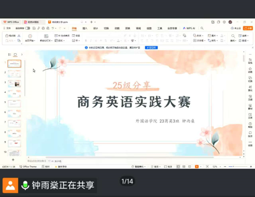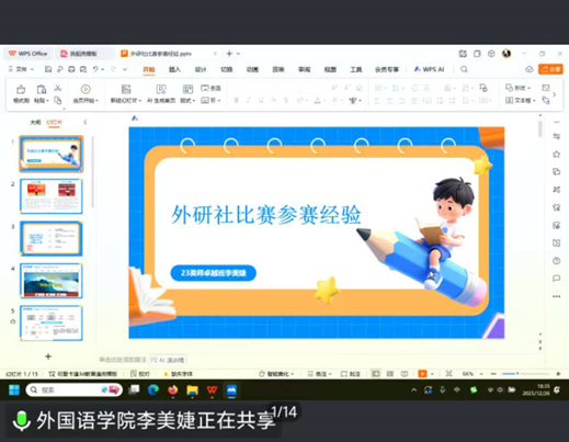 活动中,23级英语师范(卓越班)李美婕同学结合自身参赛经历,围绕外研社系列赛事,从竞赛定位、赛制流程、备赛方法及能力提升等方面进行了详细分享。她以实例说明竞赛在夯实语言基本功、提升教学素养和综合表达能力中的重要作用,引导新生合理规划、循序参与。随后,23级商务英语3班钟雨燊同学聚焦商务英语实践大赛,重点介绍了赛事的实践导向、团队协作要求及备赛过程中的能力锻炼,鼓励新生将课堂所学与真实情境相结合,在竞赛中提升专业应用能力与职业素养。