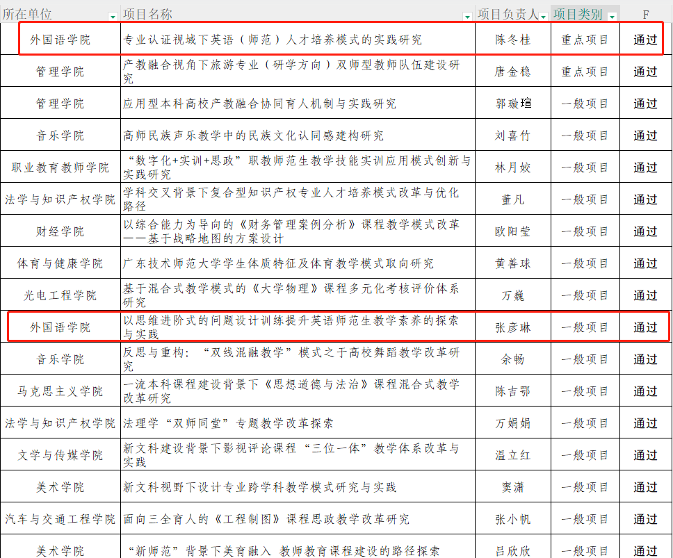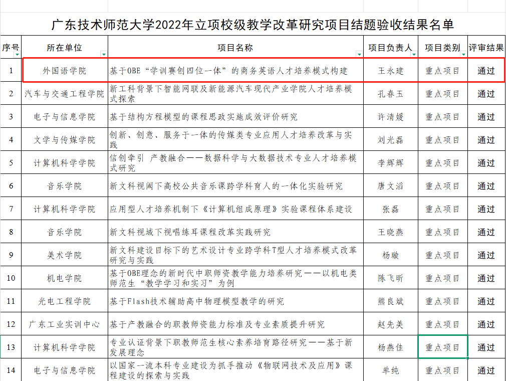 公司王永建老师负责的《基于OBE“学训赛创四位一体”的商务英语人才培养模式构建》、陈冬桂老师负责的《专业认证视域下英语(师范)人才培养模式的实践研究》、张彦琳老师负责的《以思维进阶式的问题设计训练提升英语师范生教学素养的探索与实践》、叶薇老师负责《课堂展示的形成性评价应用实践研究》、倪菲菲老师负责的《给养理论视阈下大学英语教师课程思政教学能力的提升路径探索》、王家明老师负责的《职前英语教师专业发展愿景的提升与实现》、邵朝杨老师负责的《基于混合式教学的<高级英语>课程思政研究》、李逸涵老师负责的《外语专业课程思政教学改革实践路径探索——以<跨文化商务交际导论>课程为例》、赵梁信子老师负责的《“干预-反应”模型在大学英语视听说课程混合教学模式中的应用研究》、邬海厅老师负责的《“文化自信”背景下日语笔译课程的思政探索》获公司2022年立项校级教学改革研究项目结题验收结果通过