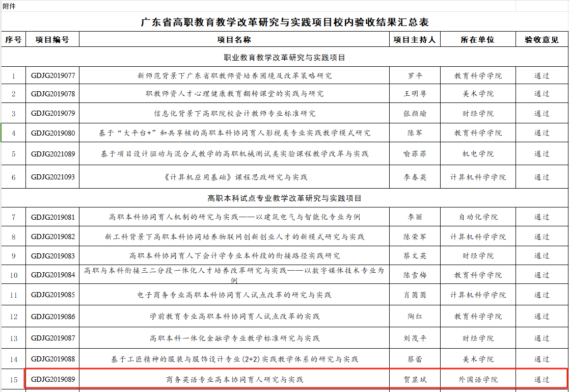 公司贺显斌老师负责的《商务英语专业高本协同育人研究与实践》获广东省高职公司产品改革研究与实践项目校内验收结果通过