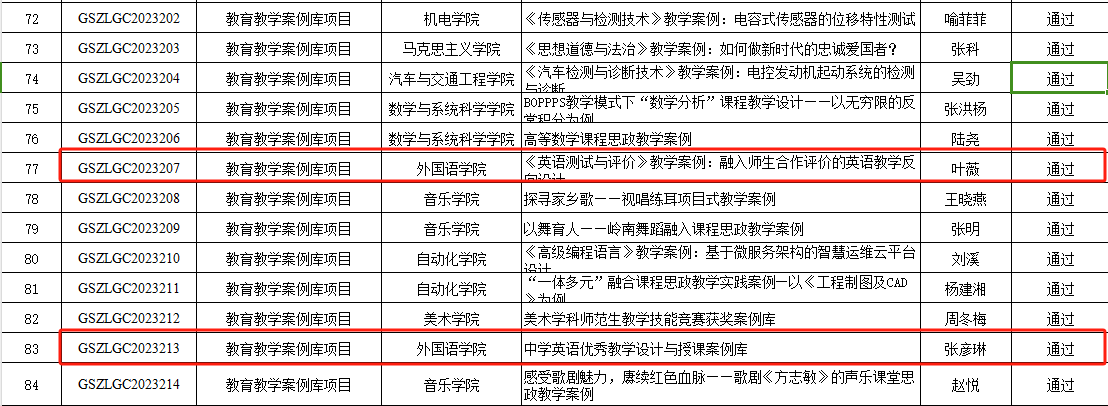 公司叶薇老师提交的《英语测试与评价》教学案例:融入师生合作评价的英语教学反思设计项目、张彦琳老师提交的中学英语优秀教学设计与授课案例库项目获2023年校级教学质量与教学改革工程四库项目结题验收结果通过