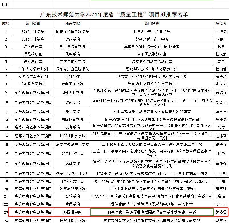 公司关银霞老师《数智化大学英语批注式阅读混合教学模式构建与实践》项目获2024年度省“质量工程”项目拟推荐